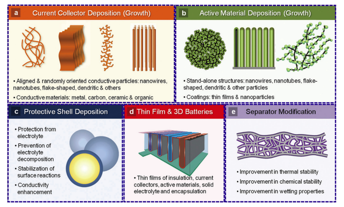 ALD已經(jīng)被公認(rèn)是一種非常有前途的工具可以用來(lái)解決鋰離子電池以及其他電能儲(chǔ)存設(shè)備所面臨的問(wèn)題。ALD在鋰離子電池中的應(yīng)用主要分為兩個(gè)方面:(1)高性能電池電極,隔膜,集流體材料等的制備;(2)表面修飾。其應(yīng)用主要總結(jié)在下圖[1]: