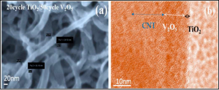 采用ALD技術(shù)制備的負(fù)極材料主要集中在過(guò)渡金屬氧化物(TMOs), 如RuO2, SnO2, TiO2和ZnO. 其能量密度比傳統(tǒng)的石墨電極高。同時(shí),為了解決TMOs負(fù)極材料所面臨的挑戰(zhàn),如SnO2在循環(huán)過(guò)程中較大的體積變化,TiO2低的電子跟離子電導(dǎo)率,由超高電導(dǎo)率的碳基材料如石墨烯,碳納米管以及Mxenes與TOMs組成的復(fù)合負(fù)極材料可以很好的融合兩者的優(yōu)勢(shì)。