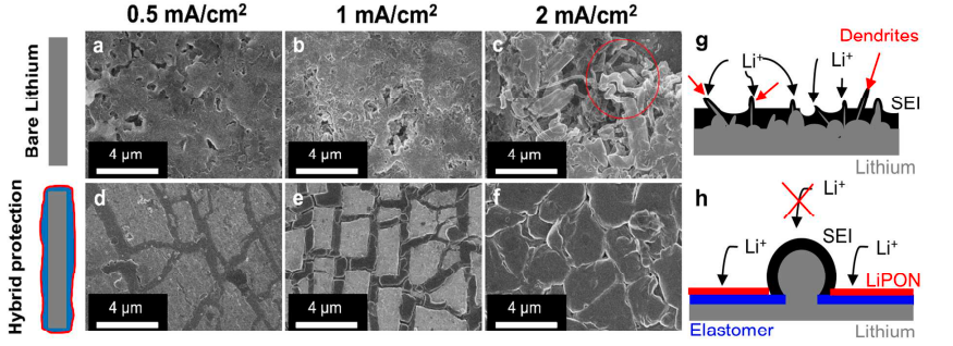 鋰金屬作為負(fù)極材料的未來(lái)之星,在鋰金屬的沉積跟剝離過(guò)程中,鋰枝晶的生長(zhǎng)導(dǎo)致電池短路的問(wèn)題亟待解決。采用ALD技術(shù)在鋰金屬表面構(gòu)建例如有機(jī)/無(wú)機(jī)復(fù)合人工SEI膜,可以有效地抑制鋰枝晶的生長(zhǎng)[5]。