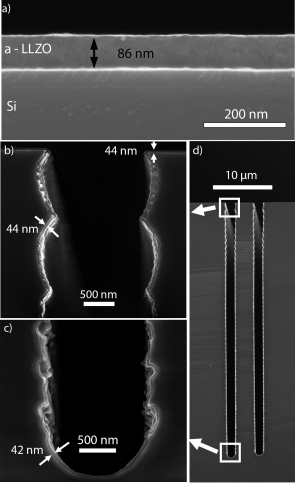 歸功于其安全性及循環(huán)穩(wěn)定性,全固態(tài)鋰離子電池近來(lái)成為了研究的熱點(diǎn)。ALD可以解決全固態(tài)鋰離子電池所面臨的兩大關(guān)鍵性挑戰(zhàn):a.高界面阻抗,b.低離子電導(dǎo)率。 最近采用ALD制備的固態(tài)電解質(zhì)有LiPON, Li7La3Zr2O12, LixAlySizO, LixTayOz, LixAlyS and Li2O-SiO2.這些含鋰SSEs提供了一個(gè)關(guān)鍵的技術(shù)平臺(tái)來(lái)制備高能量密度,長(zhǎng)壽命以及安全的可充放電池。如下圖所示,ALD制備的LLZO為制備3D全固態(tài)鋰離子微電池提供了一條技術(shù)路線[4]。