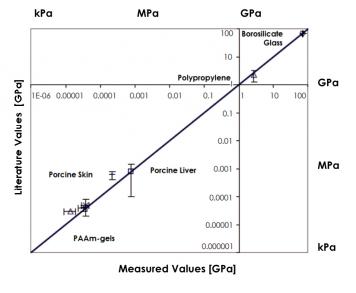NanoTest 納米力學(xué)測(cè)試系統(tǒng)的液體池模塊能對(duì)生物材料、組織、細(xì)胞器、細(xì)胞層、軟骨、靜電支架、牙釉質(zhì)等在液體環(huán)境中進(jìn)行力學(xué)性能表征,不僅為生物材料以及組織研究人員和工程師提供完美的解決方案,也是組織工程和再生醫(yī)學(xué)的研究者衡量他們感興趣材料剛度的良好選擇。 例如:研究生物材料大范圍的剛度值:麻省理工學(xué)院的研究表明,納米測(cè)試液體細(xì)胞的納米壓痕可以在樣品完全浸入液體的情況下進(jìn)行,從高度柔順的凝膠到生物組織,材料的硬度跨越幾個(gè)數(shù)量級(jí)。
