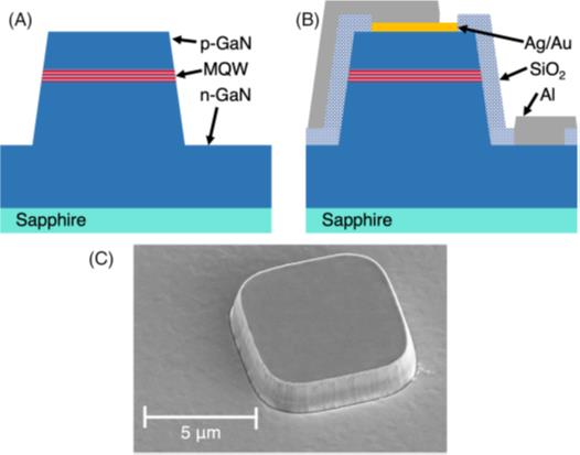 在本研究中,我們使用了在微圖案化藍寶石上外延生長的GaN和InGaN的市售藍色LED晶圓(448nm中心波長)。外延生長疊層由未摻雜的GaN、n型GaN、多量子阱(MQW)和p型GaN組成。每個量子阱包含在未摻雜的GaN勢壘之間的幾nm厚的InGaN發(fā)射區(qū)。晶圓首先通過機械研磨減薄至約200μm厚,并隱形切割成10×10mm2的裸片進行加工。然后用PECVD 沉積500nm的SiO2涂覆每個裸片以在LED形成期間用作硬掩模。用LOR5A和S1805涂覆SiO2以進行雙層抗蝕劑剝離工藝。在直接寫入模式下使用DWL66+對抗蝕劑進行構(gòu)圖,以產(chǎn)生每個裸片200個邊長為5、10、15、20、25、50、100和500μm的方形LED。每個裸片有25個每種尺寸的LED;在溶劑浴中以電子束沉積并剝離50nm的鉻。在Oxford 100干式蝕刻機中使用CHF3和氬氣對SiO2硬掩模進行圖案化。在GaN蝕刻之前對鉻的剩余部分進行濕法蝕刻,以防止再沉積的鉻污染LED側(cè)壁。然后使用Cl2和BCl3的混合物將GaN干法蝕刻至1100nm的深度,以暴露MQW下方的n-GaN層。剩余的SiO2在10∶1緩沖氧化物蝕刻劑(BOE)中被濕法蝕刻。然后在成像之前用丙酮和氧等離子體清潔樣品。圖1顯示了像素的示意圖和SEM圖像。
