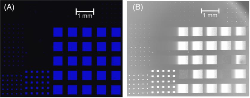 圖3無損圖像。(A)200個LED的PL合成圖像。幾個圖像被縫合在一起以覆蓋整個設(shè)備區(qū)域。此圖中的所有指示燈均點亮。(B) 來自(A)的相同200個LED的CLSEM圖像。盡管大多數(shù)LED都會發(fā)光,但也有一些是不發(fā)光的。