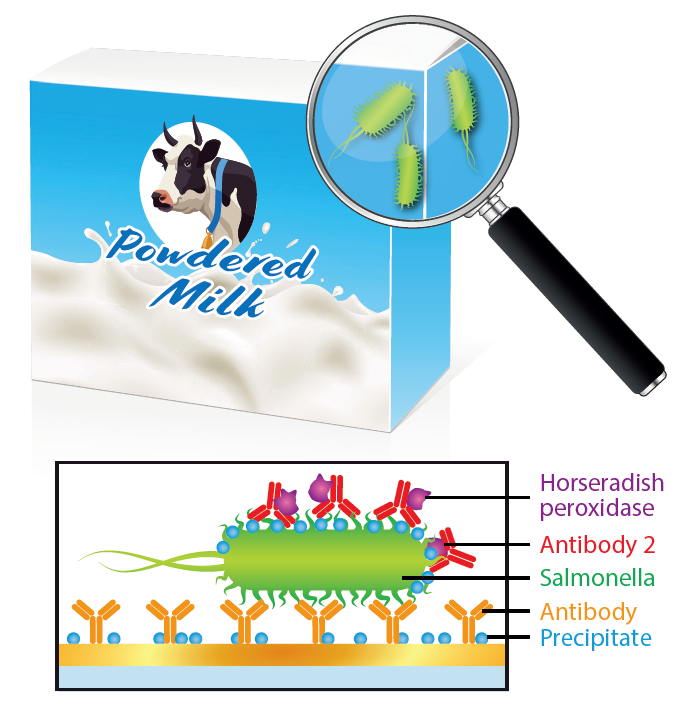 圖2。沙門氏菌的檢測(cè)是基于抗體(HRP-Ab2)與細(xì)菌的結(jié)合和辣根過氧化物酶的生物催化沉淀。幾個(gè)HRP-Ab2結(jié)合在一個(gè)細(xì)菌上導(dǎo)致信號(hào)呈指數(shù)級(jí)擴(kuò)增。