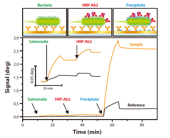圖1所示。多參數(shù)表面等離子體共振(MP-SPR)檢測(cè)奶粉中沙門氏菌。辣根過氧化物酶抗體2 (HRP-Ab2)特異性結(jié)合沙門氏菌和沉淀物的形成。
