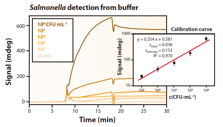 該生物傳感器首先在Biacore 3000 SPR儀器上開發(fā),LOD達(dá)到104 CFU/mL。為了進(jìn)一步改進(jìn)生物傳感器,選擇了生物催化沉淀反應(yīng)來提高靈敏度。然而,辣根過氧化物酶需要使用乙醇。Biacore儀器與醇不兼容,不像BioNavis MP-SPR儀器,它對(duì)有機(jī)溶劑具有優(yōu)異的抵抗力。因此,選擇MP-SPR Navi?210A VASA進(jìn)行進(jìn)一步研究。