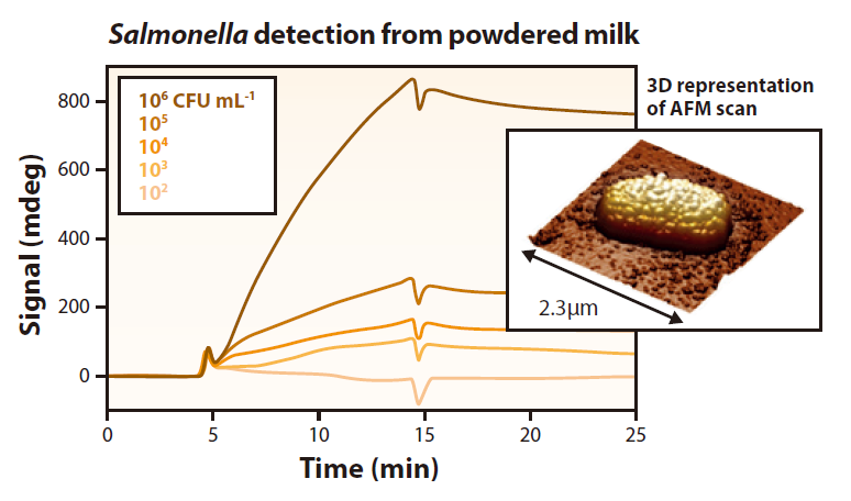 MP-SPR是一種高靈敏度、高選擇性的生物傳感器,可用于檢測(cè)食品樣品中的細(xì)菌。例如,MP-SPR對(duì)于食品和飼料安全、環(huán)境安全、臨床診斷、邊界和過程控制等方面的檢測(cè)開發(fā)具有不可估量的價(jià)值。在生物傳感器開發(fā)中使用MP-SPR的主要好處是: 與有機(jī)溶劑的相容性,易于修改傳感器表面,能夠處理原始樣品。
