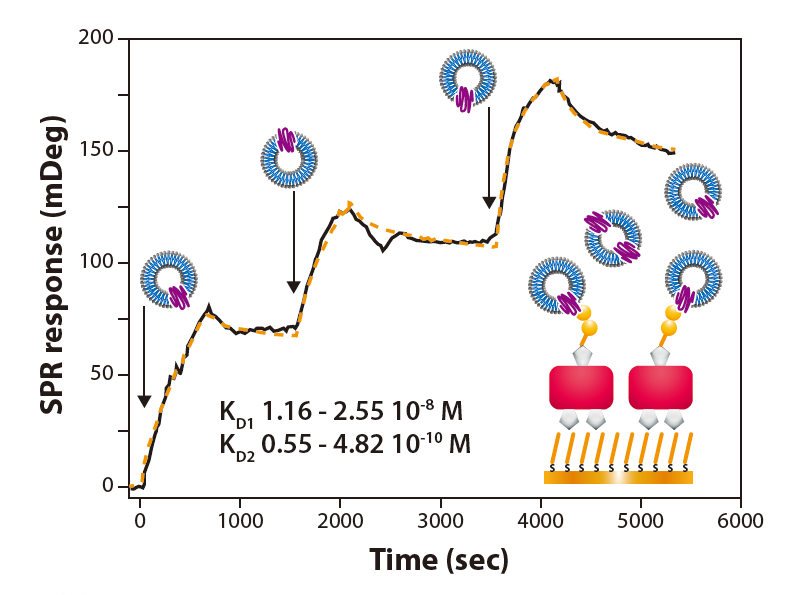 通過(guò)MP-SPR確定表面結(jié)合肽(LXY30)與流動(dòng)的細(xì)胞外囊泡(SKOV-3)的相互作用(圖1)。使用TraceDrawer?軟件的“兩位點(diǎn)”結(jié)合模型分析相互作用,將其解釋為兩組肽分子與一個(gè)細(xì)胞外囊泡結(jié)合。本文對(duì)三種假設(shè)的電動(dòng)汽車(chē)進(jìn)行了評(píng)估,其中表面α3β1整合素的含量被評(píng)估為每顆??偟鞍椎?%,5%或10%。所有三個(gè)病例的親和力表明SKOV-3顆粒與表面結(jié)合的LXY30配體的強(qiáng)結(jié)合(圖2,表1)。在本研究中,僅測(cè)量了三種濃度的分析物,然而,通常建議測(cè)量五種或更多濃度來(lái)評(píng)估親和力和動(dòng)力學(xué)。