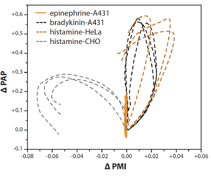 A431細(xì)胞受到緩激肽和腎上腺素的刺激。緩激素與緩激素B2受體結(jié)合,激活Gq通路,而腎上腺素與β2腎上腺素受體結(jié)合,激活Gs通路(圖2)。不同濃度的腎上腺素和緩激素刺激A431細(xì)胞導(dǎo)致獨特的時間依賴性PAP譜(圖3)。組胺結(jié)合組胺H1和H3受體,分別激活Gq和Gi通路。這導(dǎo)致了同樣獨特的PAP譜(數(shù)據(jù)未顯示)。