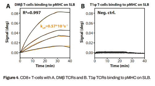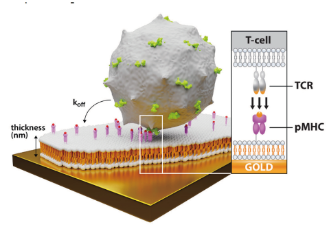 評(píng)估t細(xì)胞對(duì)腫瘤相關(guān)抗原的特異性對(duì)于開發(fā)針對(duì)癌癥的個(gè)性化免疫療法至關(guān)重要。應(yīng)用多參數(shù)表面等離子體共振(MP-SPR)技術(shù)表征腫瘤特異性CD8+ t細(xì)胞中t細(xì)胞受體(TCR)的相互作用。完整的活細(xì)胞被捕獲到由肽-主要組織相容性復(fù)合物(pMHC)功能化的人造細(xì)胞膜組成的仿生表面上。在4個(gè)不同的t細(xì)胞群體中完成了TCR和pMHC之間免疫突觸形成的實(shí)時(shí)親和分析。