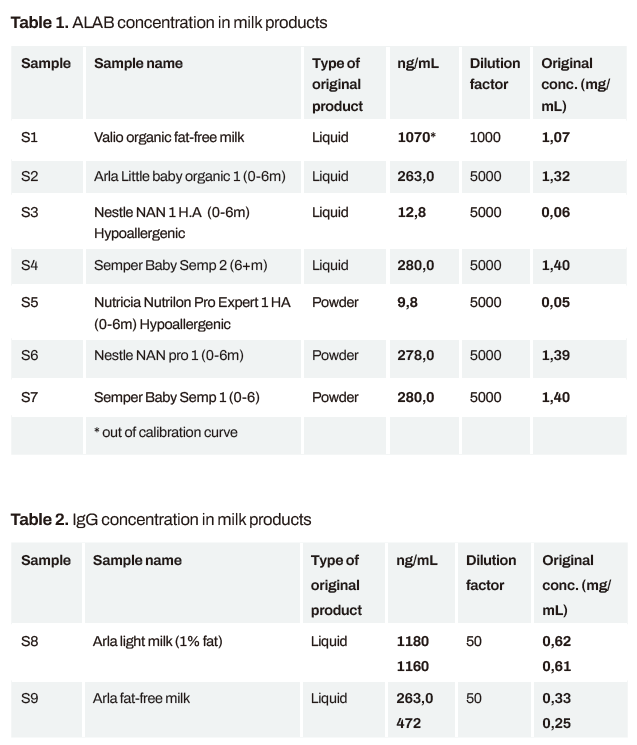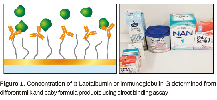 樣品是從芬蘭超市購買的不同的奶制品(圖1)。粉末樣品根據(jù)包裝上的說明制備成液體形式,并進(jìn)一步稀釋1000或50倍(正常牛奶)和5000倍(嬰兒產(chǎn)品)。使用90秒的樣品注射(校準(zhǔn)或牛奶樣品),120秒的等待時(shí)間和60秒的ALAB再生注射進(jìn)行測(cè)量。IgG注射時(shí)間較長。ALAB的校準(zhǔn)范圍為0 - 1000 ng/mL, IgG的校準(zhǔn)范圍為0 - 75 000 ng/mL。校正曲線符合4參數(shù)Low-High方程,也可用于測(cè)定樣品中的蛋白質(zhì)濃度。