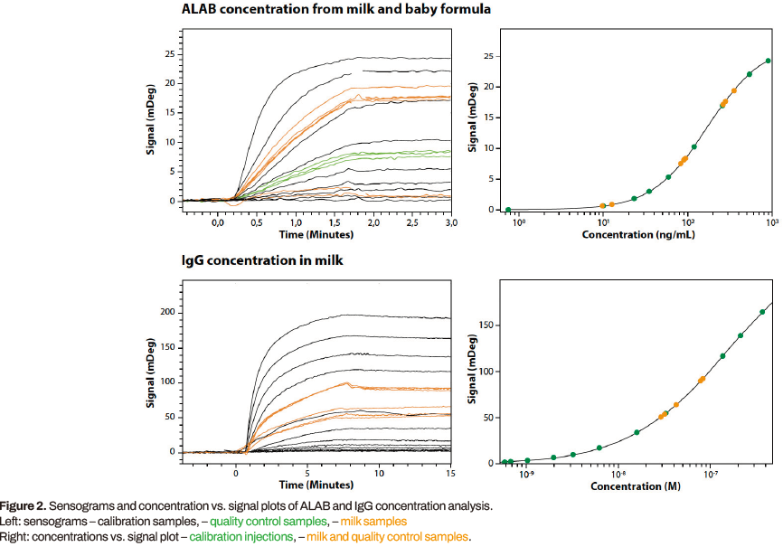 采用多參數(shù)表面等離子體共振(MP-SPR)儀器可以測(cè)定牛奶和乳基嬰兒配方奶粉中蛋白質(zhì)的濃度。α-乳清蛋白(ALAB)是嬰兒重要的營養(yǎng)蛋白,免疫球蛋白G (IgG)是二次免疫應(yīng)答的重要組成部分。根據(jù)校準(zhǔn)曲線確定未知樣品的濃度。該試驗(yàn)是使用固定在表面的抗alab抗體或抗igg抗體的直接結(jié)合試驗(yàn)。同樣的分析格式可用于檢測(cè)其他類似的感興趣的蛋白質(zhì),如抗生素殘留、毒素、過敏原或營養(yǎng)物質(zhì)。