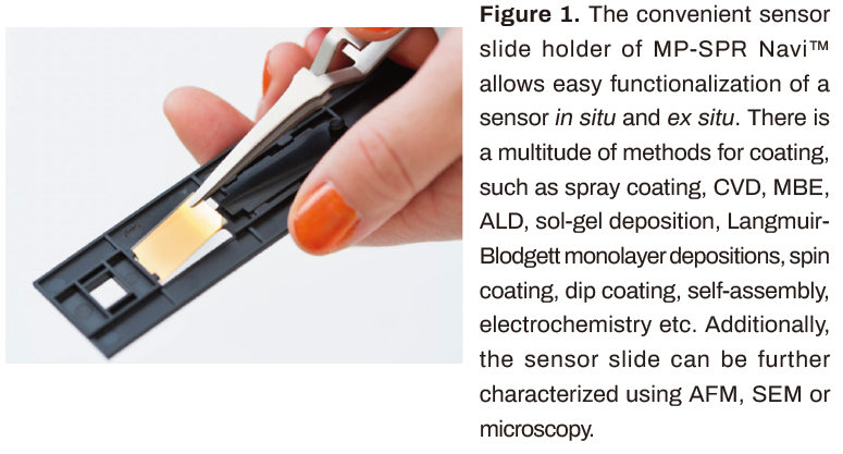 MP-SPR可以測量分子的吸附,同樣的測量也提供了層厚度和光學性質的信息。對于大多數透明材料,測量的層厚度范圍可以從納米到微米。層表征可以在空氣和各種溶劑中無縫地完成,而不需要改變儀器設置。與MP-SPR一起使用的彈性體涂層棱鏡允許無油操作,結合方便的傳感器滑動支架(圖1),可以使用其他方法(如AFM或SEM)進一步表征涂層。此外,傳感器滑動片可以很容易地在原位和非原位涂覆。