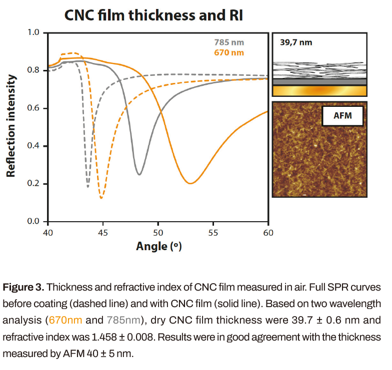 采用硫酸水解法制備CNC。CNC尺寸為4 ~ 15 nm × 50 ~ 306 nm,平均長度分別為8 nm和122 nm,由AFM測量100個顆粒。用水虎魚溶液(3:1濃硫酸:雙氧水)清洗SiO2涂層的SPR傳感器載玻片。cnc在氮氣中以4000 rpm的轉速旋轉30 s,加減速時間為7秒。通過改變CNC懸浮液濃度在1到3個重量百分比之間來控制層厚度。傳感器載玻片在80°C下熱處理8小時,以去除薄膜中的水分,然后進行保濕和再加熱(過夜),以減少薄膜中的取向。