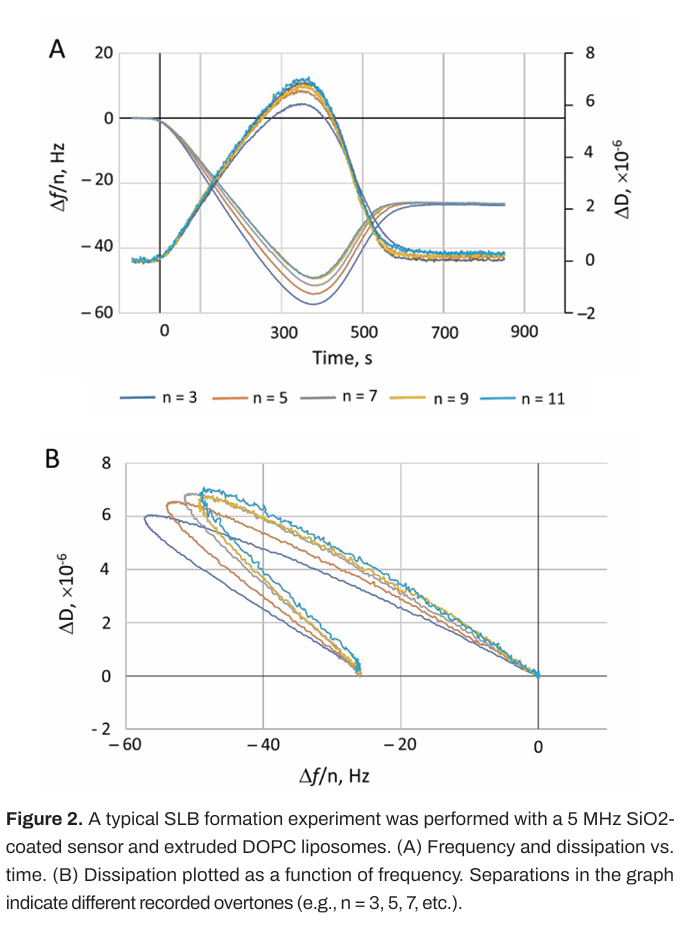 這里,Δf是基頻變化,Δm是單位面積增加層的質(zhì)量,C是與石英性質(zhì)有關(guān)的所謂質(zhì)量靈敏度常數(shù)(對于5 MHz晶體,C = 17.7 ng/(cm2Hz))。圖2B給出了相同的數(shù)據(jù),繪制為耗散與頻率的關(guān)系(稱為Df圖)。頻移值與文獻報道的值一致,表明BioNavis QCMD系統(tǒng)可靠地記錄小耗散值并準確地跟蹤其變化。圖2A所示的結(jié)果代表了SLB在不同泛音處形成的經(jīng)典特征,其中完整的脂質(zhì)體最初吸附,導(dǎo)致頻率和耗散的顯著變化,隨后轉(zhuǎn)化為具有最小耗散的平面雙層。