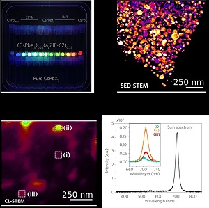 Ps:混合鹵化鉛鈣鈦礦和金屬有機(jī)骨架復(fù)合材料顯示出顯著的穩(wěn)定性和發(fā)光效率(左上)。掃描透射電子顯微鏡(STEM)的納米級(jí)電子衍射允許人們識(shí)別單個(gè)CsPbX3納米晶體的相(右上角)。最后,STEM上的陰極發(fā)光(CL)表明光來(lái)自單個(gè)納米晶體(左下),它們的發(fā)射光譜(右下)非常相似。