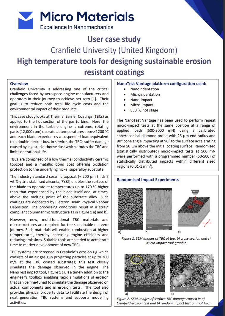 該研究描述了Micro Materials 客戶克蘭菲爾德大學(xué)的研究人員在開發(fā)新型可持續(xù)耐腐蝕涂層的項目中進(jìn)行的一系列高溫微沖擊測試。測試還包括由MML首創(chuàng)的隨機(jī)沖擊測試。例如,當(dāng)被航空發(fā)動機(jī)制造商使用時,這種新涂層將降低成本,也減少了發(fā)動機(jī)對環(huán)境的影響。完整的案例研究如下:
