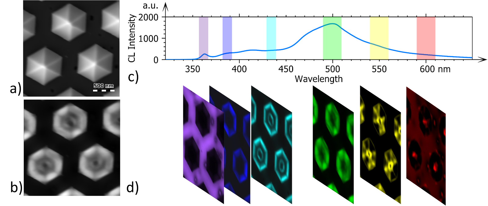 1、GaInN/GaN多量子殼納米線微發(fā)光二極管(MicroLED)是下一代顯示設(shè)備的有力競(jìng)爭(zhēng)者。利用CL超光譜成像技術(shù)可以對(duì)它們的發(fā)光特性進(jìn)行詳細(xì)表征。下圖a和b展示了從頂部視角獲取的結(jié)構(gòu)的二次電子(SE)和全色CL強(qiáng)度圖像。圖c展示了整個(gè)圖像的平均發(fā)射光譜。通過(guò)在不同波長(zhǎng)范圍(通常在發(fā)射峰附近)上積分發(fā)射強(qiáng)度,可以得到不同的圖像(圖d),稱(chēng)為彩色帶圖像,這些圖像可以代表堆疊中的特定材料或一種材料的特定特性。