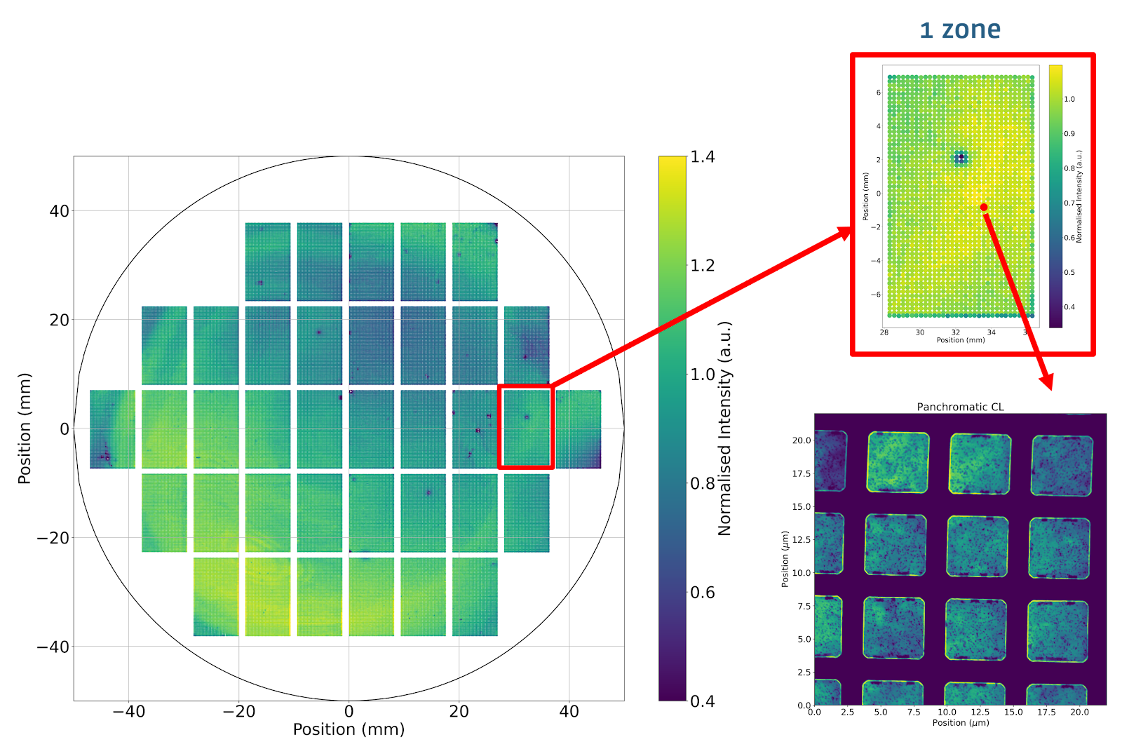 2、qCL使得在每個(gè)器件內(nèi)部、器件之間以及晶圓全表面各區(qū)域之間進(jìn)行比較成為可能。這種定量比較對(duì)于識(shí)別工藝變化和潛在故障具有極大的價(jià)值。它能夠平滑地銜接納米尺度和毫米尺度的器件特性,并能夠高效地表征沉積工藝的均勻性、光刻工藝的質(zhì)量以及器件的基本發(fā)射特性,下圖為使用全晶圓qCL工具(Santis 300)獲取的MicroLED陣列全晶圓圖譜。qCL的使用確保了每個(gè)器件、不同器件之間、晶圓區(qū)域之間以及不同晶圓和晶圓批次之間的光強(qiáng)度測(cè)量結(jié)果具有可比性,這對(duì)于生產(chǎn)監(jiān)控至關(guān)重要。