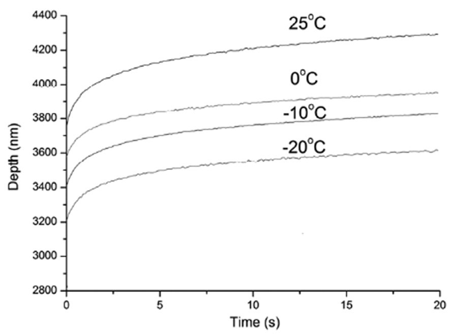 低溫對聚合物薄膜蠕變行為的影響是聚合物研究的一個重要領域。MicroMaterials低溫樣品臺使用業(yè)界領先的NanoTest熱穩(wěn)定性進行研究。這種穩(wěn)定性可以從未經處理的數據中直接評估蠕變行為,即使在最低溫度下,也能保持在峰值負荷。圖2展示了一個蠕變試驗的例子:隨著溫度降低,由于樣品黏彈性行為的降低,在峰值載荷下的蠕變速率也隨之減小。