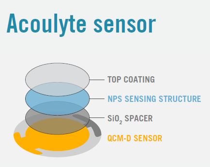 Acoulyte傳感器是在頂部金電極上沉積有SiO2間隔層的QCM-D傳感器。然后將NPS結(jié)構(gòu)沉積在該層的頂部。如果需要,傳感器表面可以覆蓋一層頂部涂層。Acoulyte傳感器直徑為14mm。NPS傳感結(jié)構(gòu)均勻分布在表面上。