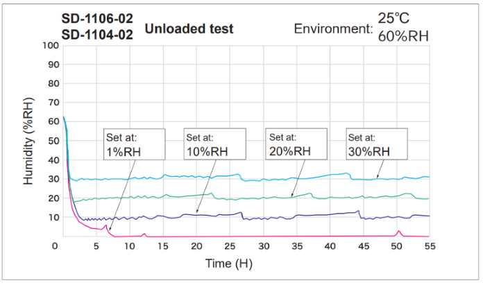 1、以下為SD-1106-02和SD-1104-02在60%RH、25℃環(huán)境下產(chǎn)品性能圖: