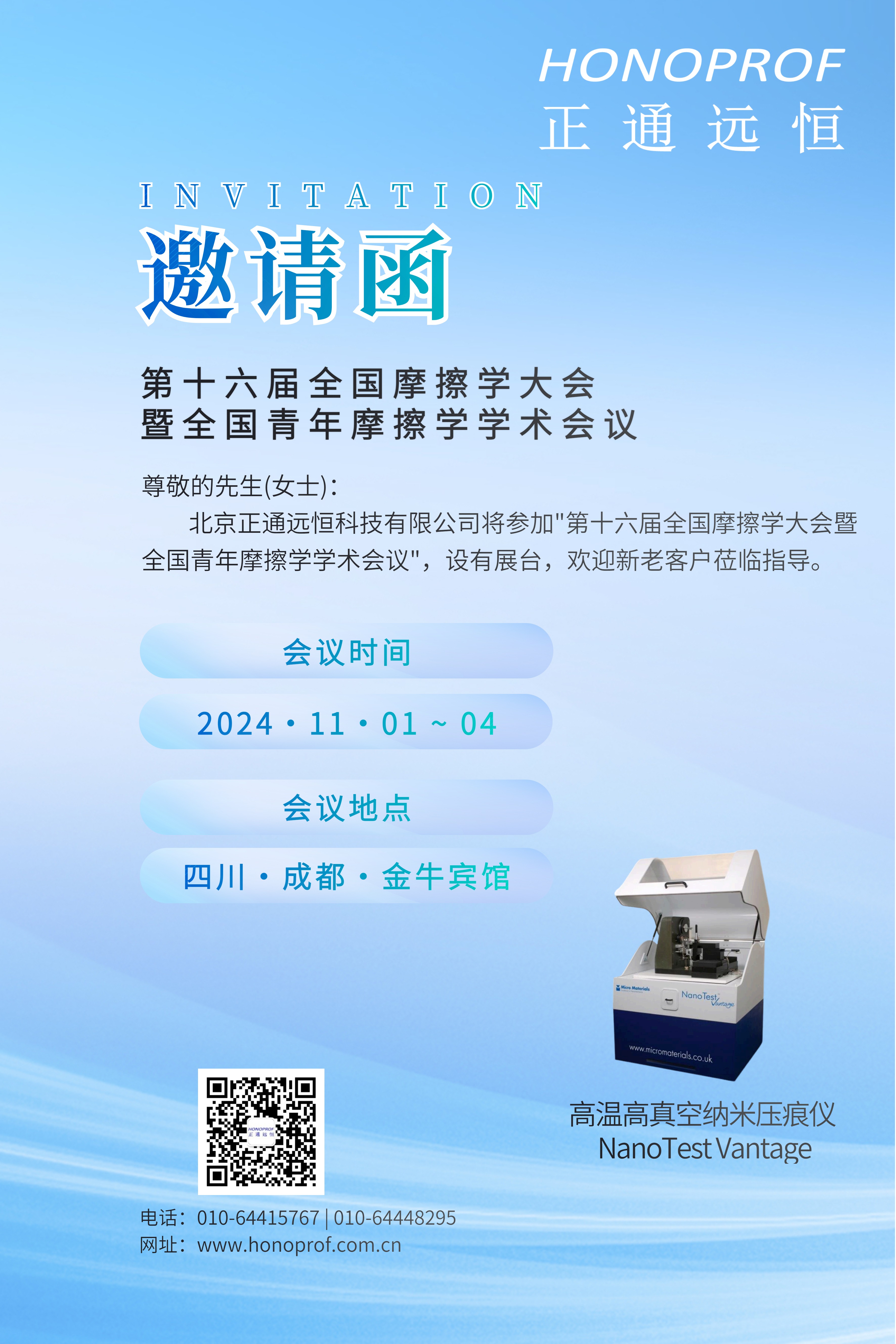 北京正通遠恒科技有限公司將于2024年11月1日-4日參加在四川省成都市金牛區(qū)金泉路2號(金牛賓館)舉辦的"第十六屆全國摩擦學大會暨全國青年摩擦學學術(shù)會議",本次會議是在中國西部召開的又一次中國摩擦學界的盛會,是中國機械工程學會摩擦學分會響應(yīng)國家“新西部大開發(fā)”和“成渝地區(qū)雙城經(jīng)濟圈建設(shè)”的具體實踐,是加快發(fā)展“新質(zhì)生產(chǎn)力”的新作為。會議的召開將會加強全國摩擦學者的深入交流,進一步推動摩擦學創(chuàng)新成果轉(zhuǎn)換,為中國制造新質(zhì)生產(chǎn)力發(fā)展添力賦能、提供堅實的科技支撐。北京正通遠恒出席此次盛會并設(shè)有展臺,歡迎新老客戶蒞臨指導(dǎo)!